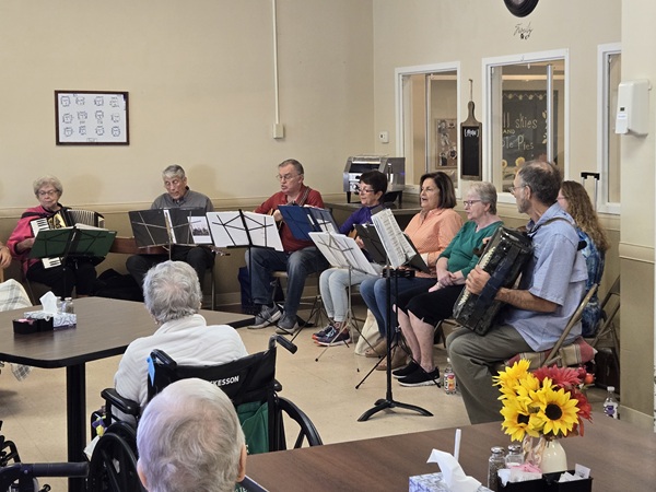 A recent sing-along held at Ennoble Nursing and Rehabilitation consisted of two accordion players, three guitarists, one violinist, one percussionist, and vocalists, along with a roomful of residents in full voice. The audience sang along on tunes like Red River Valley, Peg O’ My Heart, Redwing, My Wild Irish Rose, and the like. One of their favorites seemed to be You Are My Sunshine.
