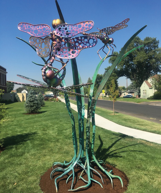 Paul Russel – Ancient Protocol: Giant dragonflies perch on giant tall grass. The dragonflies are made of an assortment of steel grades. The dragonflies are plated using zinc-nickel chromate. The grass has a brass/copper/bronze impregnated paint coating applied with a patina. High quality clear auto paint is the top coat.