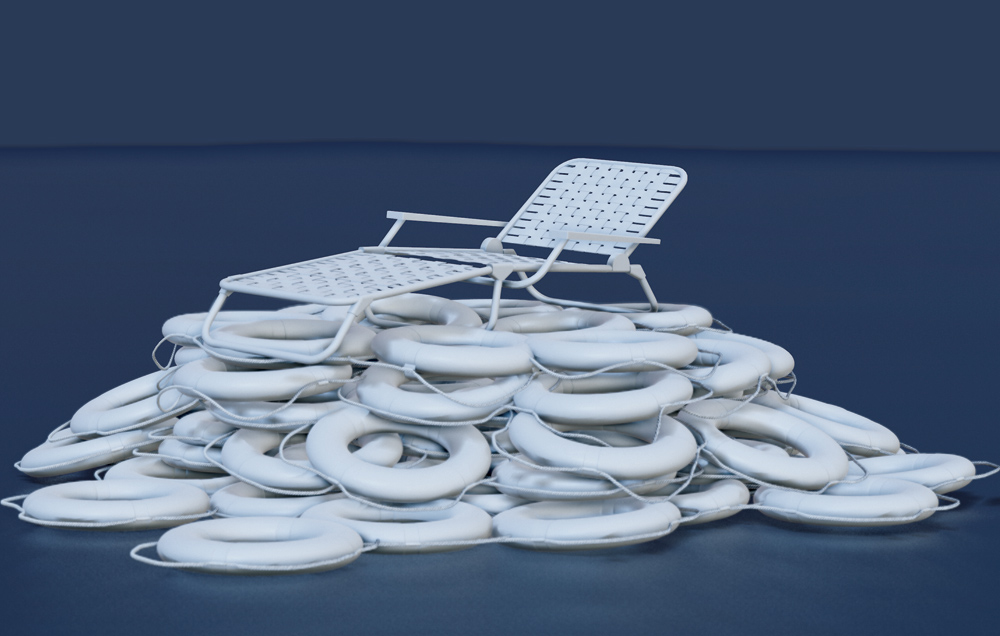 Jenny Kendler – Lounging Through the Flood (virtual project): This virtual display is of a piece made from an enormous pile of jumbled life preservers, held together with aircraft cable and topped with a vintage lawn chair – all painted white.