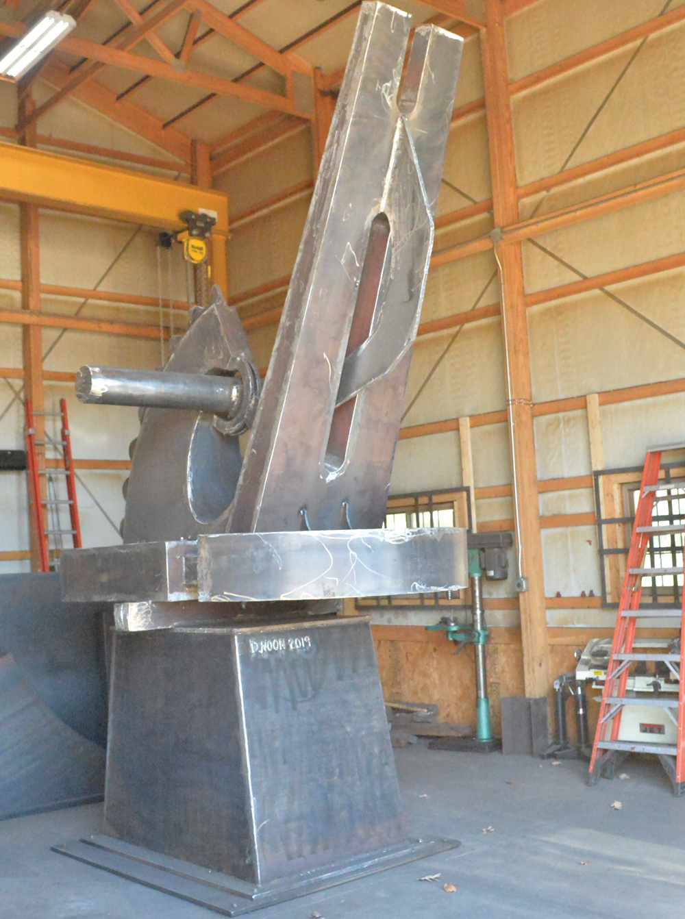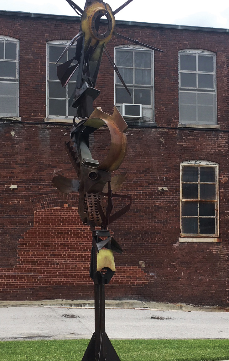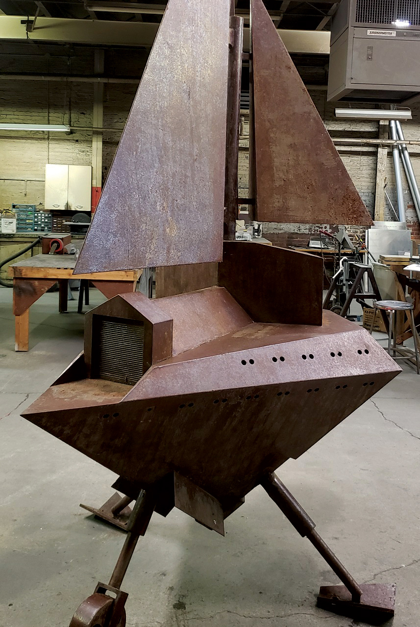 Andrew Arvanetes – Ark: Some of this sculpture’s details, doors, windows, etc., refer to the Biblical Ark. It can also be seen as a vessel, a container, a means of transport and protection. The overall design of the sculpture resembles an abstracted boat or ship. It’s oxidized finish resembles the rusted hulls of ships, barges, and bridges found on our waterways such as the nearby Mississippi River.