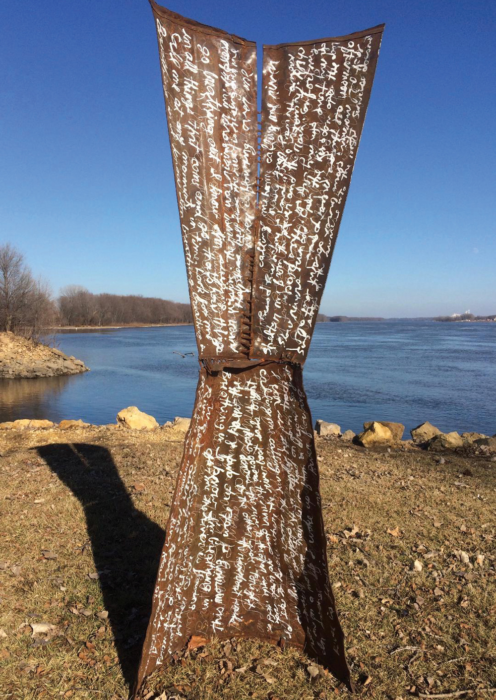Skip Willits – River Palimpsest: This is a found river buoy from the flooded forest of the Meridoshia, re-imagined. A text component was added to the sculpture, no commands, no shocking words, or statements just questions about what it means to live next to the Mississippi. The welding technique used to create most of his work is a skill learned from his father who worked in a welding shop. Skip lives and works on the banks of the Mississippi River.