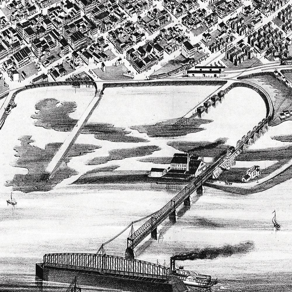 Two weeks later, civil engineers pounded a row of stakes into the thick river ice to mark the location of the bridge. By the end of February 1868, explosions from the tunnel blasting in Illinois and the thud of two, steam-powered engines driving piles through the ice into bedrock echoed across the Mississippi River valley.
