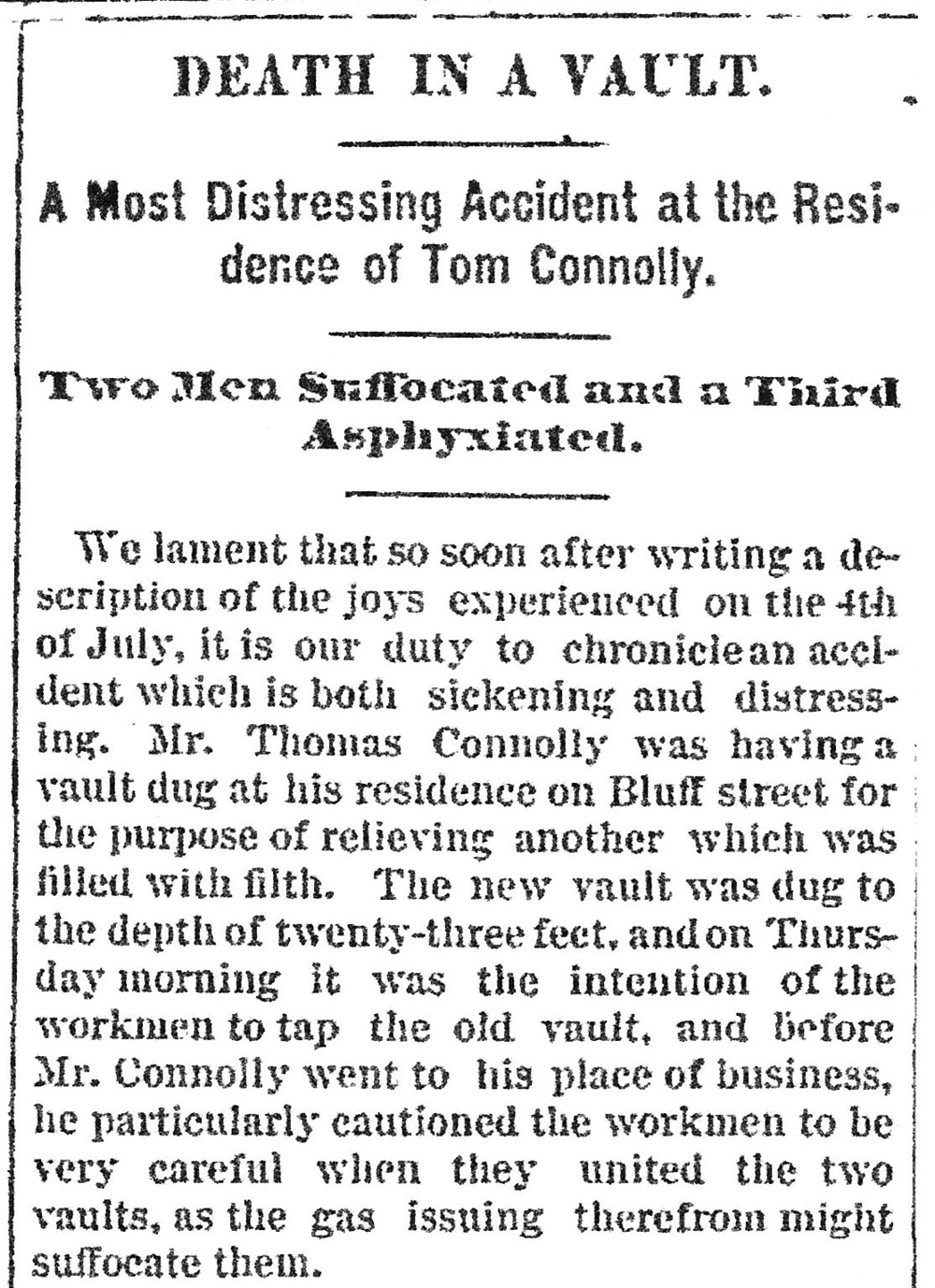 But before heading off to work, Thomas Connolly stopped in his back yard to speak with Thomas Harran and Thomas Kelly, two fellow Irishmen he had hired to dig a new privy pit behind his home. The pit had already been dug to a depth of 23 feet. All that remained was to tap into the old vault which was completely filled with filth. Mr. Connolly cautioned the men, reminding them to take care when uniting the two vaults as gas from the old pit was dangerous and might suffocate them. He gave the men an iron bar to puncture the space between the two pits.