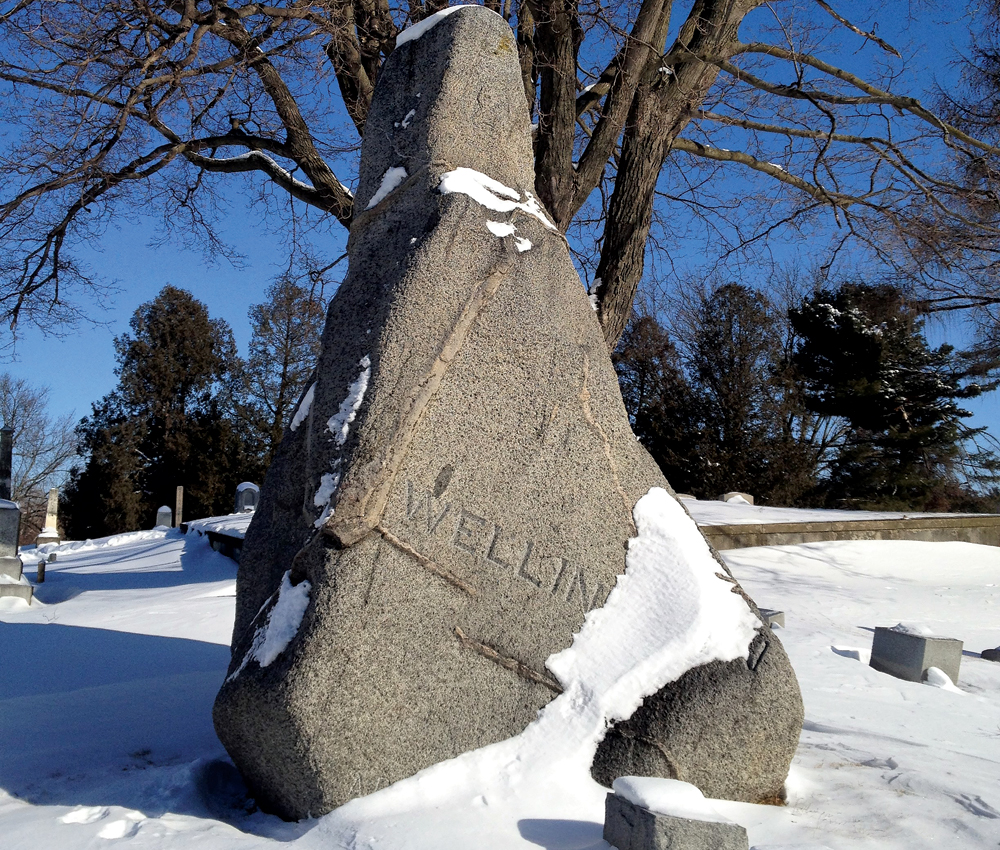 And what about that monumental stone, which looms over the Wellington graves in Linwood? Sometime before his death, William became obsessed with finding a large stone to mark his grave. When asked, he couldn’t describe what the rock might look like, but he assured everyone he would know it when he saw it. William Wellington spent a lot of time and money hunting for the perfect boulder as he traveled across the country in an exhaustive search.