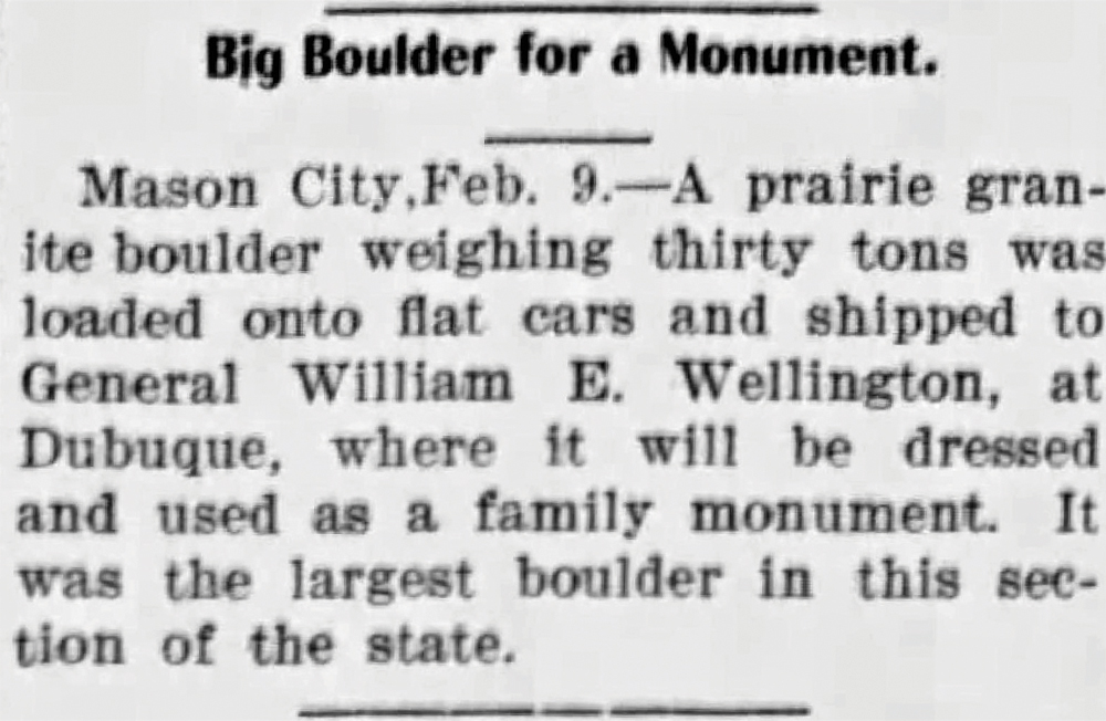 One might expect William would discover his boulder out East among the jutting stones and granite quarries. But that wasn’t the case. In 1898, he found exactly what he was looking for in a field on the Wooden Shoe Stock Farm in Thornton, IA, a small town south of Mason City. He hired a team to excavate the stone and had it transported 140 miles to Dubuque on a railroad flatcar.
