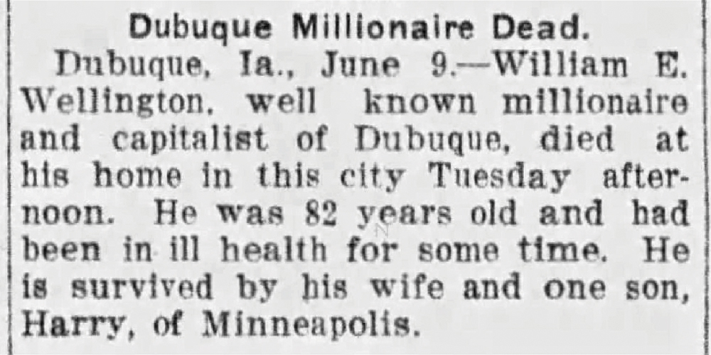 William sold his Pocahontas Co. farm and moved back to Dubuque in 1895. He hired popular architect Thomas T. Carkeek to build a home for his family at 1449 Locust Street. The house still stands as an excellent example of Queen Anne architecture. Over past decades, the former Wellington home has been converted into several apartments.